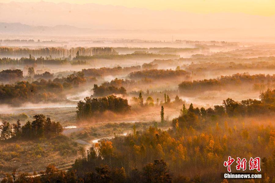 Golden shades of endless forests are pictured in the river valley of Nilka county, Ili Kazak autonomous prefecture, Northwest China's Xinjiang Uygur autonomous region, Oct 10, 2019. [Photo/Chinanews.com]