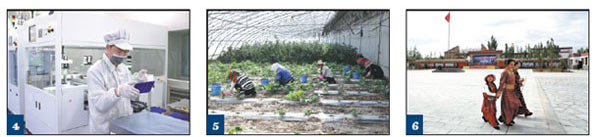 4. The IBC project production workshop of China Power Investment Corporation's Yellow River Hydropower Solar Power Co Ltd. 5. The greenhouse of the Renda Cooperative in Hongliu village, Golmud city. 6. The relocated herdsmen in Changjiangyuan village. [Photo provided to China Daily] |