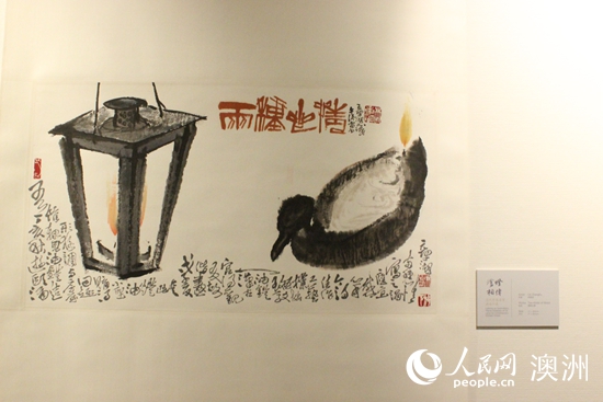 A Chinese painting with an oil lamp is on display at Lighting up Generations: Theme Exhibition of Oil Lamp by Contemporary Chinese Artists on Oct 11 in the China Cultural Center in Sydney, Australia. [Photo/People.cn]