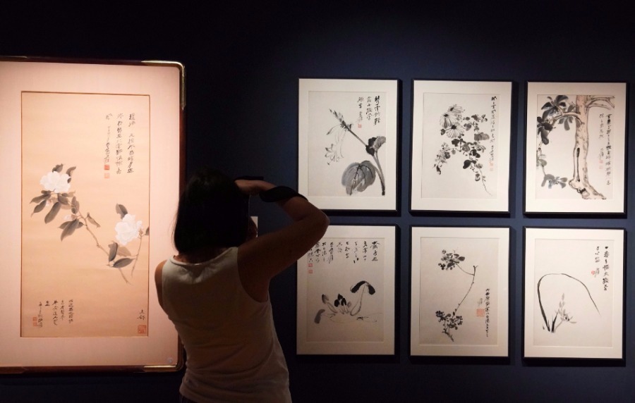 A reporter watches Zhang Daqian's work during the preview of the solo exhibition, Zhang Daqian: The Master in Hong Kong, South China, Oct 11, 2019. In commemoration of the 120th anniversary of Zhang Daqian's birthday, Sotheby'spresented the exhibition From Oct 12 to Nov 9 at Sotheby's Hong Kong Gallery. The exhibition features nearly 60 paintings sourced from the artist's family and private collectors around the world.[Photo/Xinhua] |