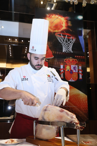 Chef Ricardo Gomez Marti slices ham at the event's opening on Oct 15, 2019. [Photo provided to chinadaily.com.cn]