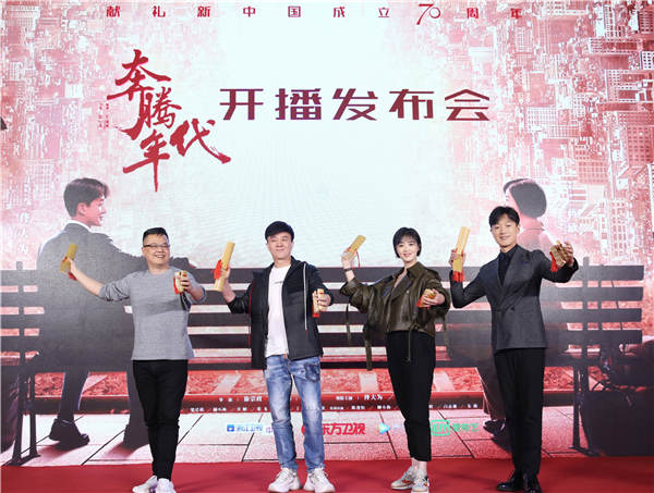 Pictured, from left, are the playwright Wang Chenggang, director Xu Zongzheng, actress Jiang Xin and actor Tong Dawei, as they pose for a photo in Beijing, Oct 16, 2019. [Photo provided to chinadaily.com.cn]