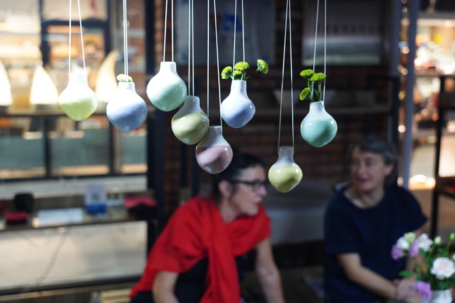 Artists display porcelain works during a porcelain fair in Jingdezhen, East China's Jiangxi province, Oct 17, 2019. An autumn porcelain fair opened Thursday in Jingdezhen, and will last for three days. [Photo/Xinhua]