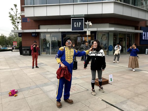 Over 100 street performers including singers, clowns, acrobats and living sculptures participate in the street art festival held in Shunyi district, Beijing. The festival attracted more than 150,000 visitors during the first weekend of October. [Photo by Yang Feiyue/China Daily] |