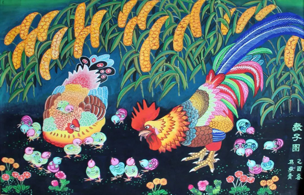 A painting by Ma Jiqing features a family of chickens. [Photo provided to China Daily] |