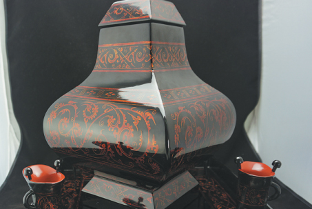 An ornately decorated black lacquer wine container, streaked with red patterning exhibited at a museum in Chengdu. [Photo provided to China Daily] |