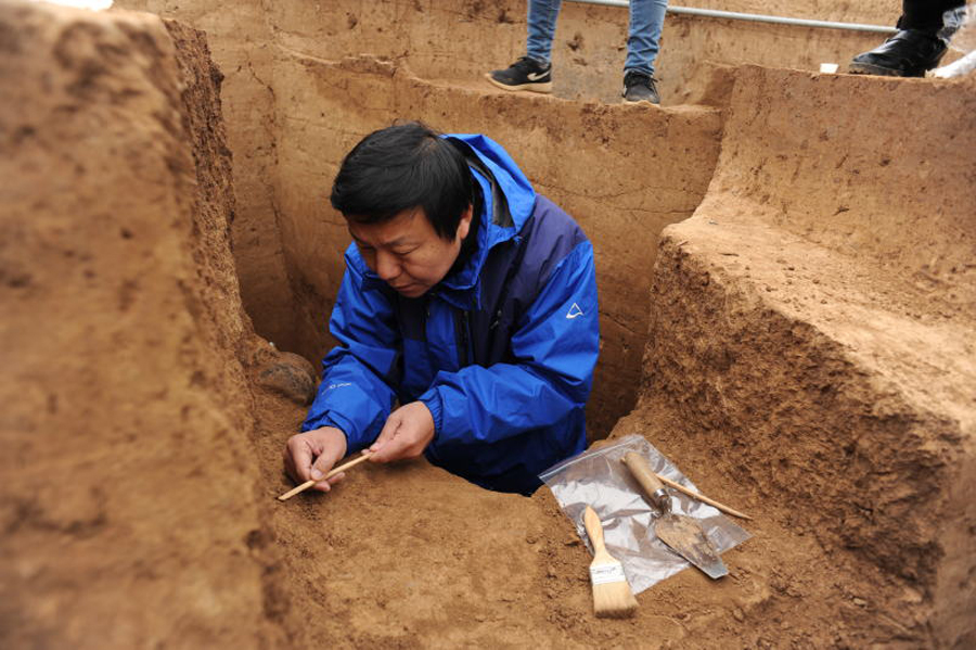 Xu Hong, leading archaeologist on Erlitou site, during an excavation in 2015. [Photo provided to China Daily] |
