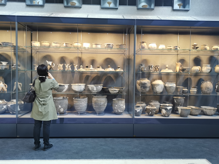 A visitor views pottery pieces on display in the newly opened Erlitou Site Museum of the Xia Capital in Luoyang, Henan province. [Photo by WANG KAIHAO/CHINA DAILY] |