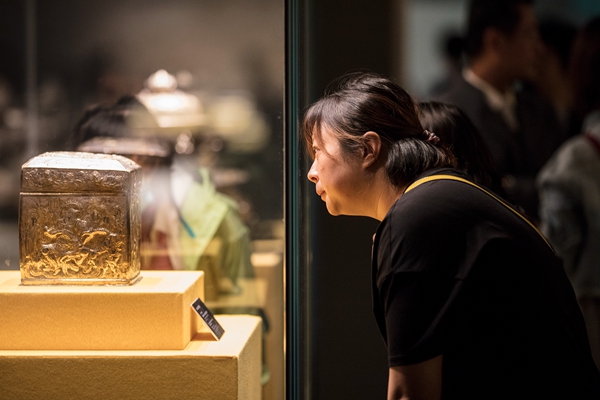 A visitor takes a look at a silver case from the Tang Dynasty at the exhibition.[Photo provided to China Daily] |