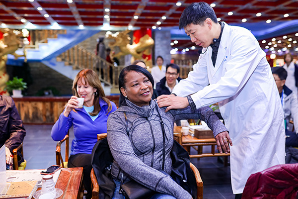 A guest is examined by a doctor who practices traditional Chinese Medicine at the Beijing International Educational Travel Conference on Oct 30. [Photo provided to China Daily]