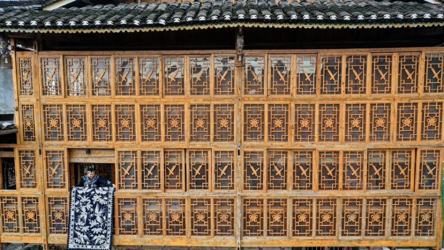 Yang Fang dries the batik cloth at home in Danzhai county, Southwest China's Guizhou province, Oct 28, 2019. Batik, a craft inherited through generations among the Miao ethnic group in Southwest China's Guizhou, has a history of more than 2,000 years. Danzhai county is a major cradle of the Miao ethnic group's batik craft. Bees wax melting, patterns drawing, indigo dyeing, and fabrics boiling are the main procedures of making batik by local people. The folk artwork is famous for its elegant color, graceful patterns and rich cultural meanings. Yang Fang, 52 years old, learnt the craft when she was 12, and was recognized as the national-level inheritor of the batik of Miao ethnic group in 2018. Through the years, Yang devoted herself into inheriting and promoting the art. In 2004, she opened a cooperative to train local women to master the craft. Her will is to see batik "blooming" among the people of Miao ethnic group.[Photo/Xinhua]