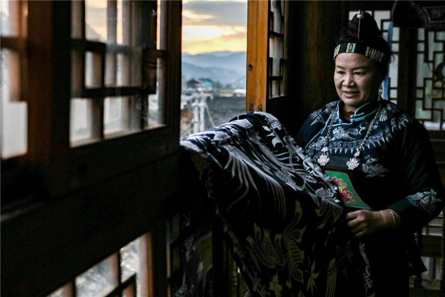 Yang Fang dries batik cloth at home in Danzhai county, Southwest China's Guizhou province, on Oct 28, 2019. [Photo/Xinhua] |