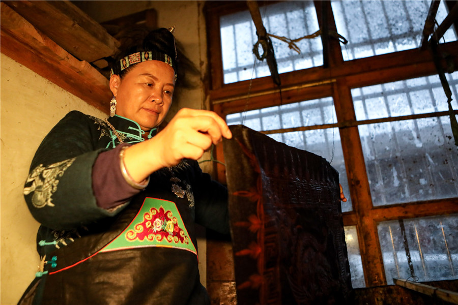 Yang Fang checks a silk scarf made with batik in Danzhai county, Southwest China's Guizhou province. [Photo/Xinhua]