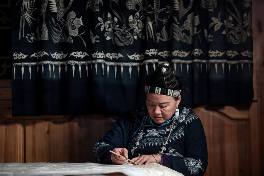 Yang Fang draws batik patterns at home in Danzhai county, Southwest China's Guizhou province, on Oct 28, 2019. [Photo/Xinhua]