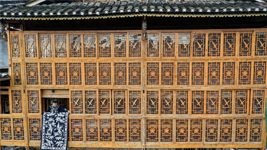 Yang Fang dries batik cloth at home in Danzhai county, Southwest China's Guizhou province, on Oct 28, 2019. [Photo/Xinhua]