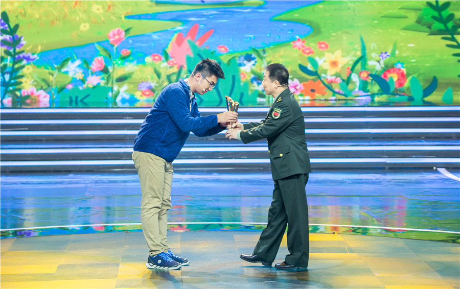 Yu Qiwei from Chengdu, Southwest China's Sichuan province, accepts the award from astronaut Yang Liwei during the award ceremony. [Photo provided to chinadaily.com.cn] |