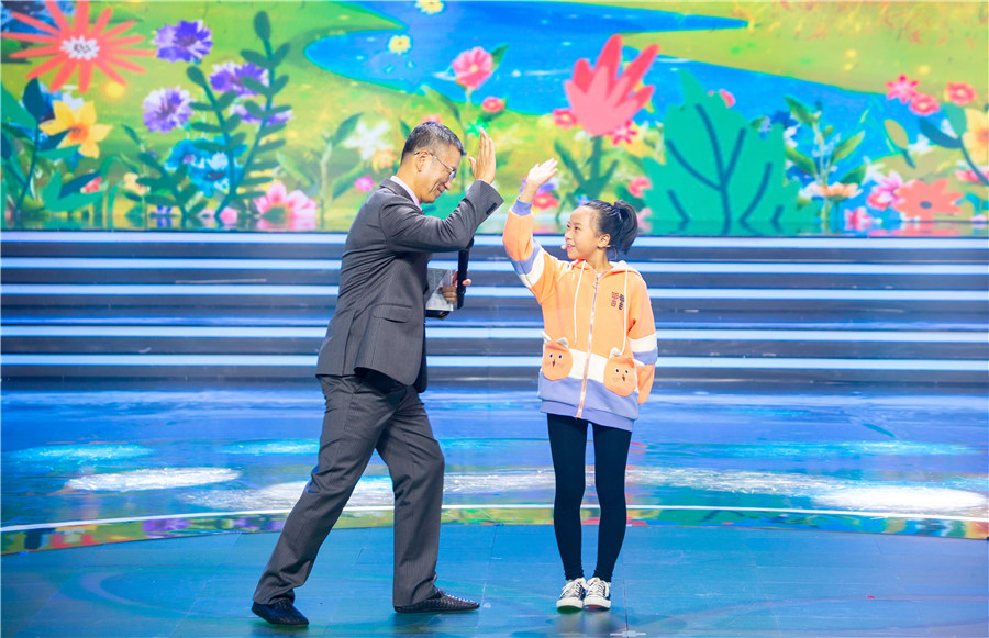 Wang Lingyun, from Central China's Hubei province, shares a high-five with host Bai Yansong onstage. [Photo provided to chinadaily.com.cn]