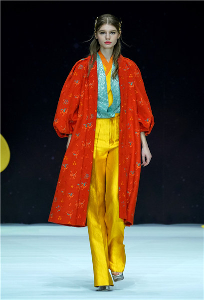 A model wearing a design inspired by traditional Chinese culture walks down the runway on Oct 31, 2019. [Photo/Xinhua]