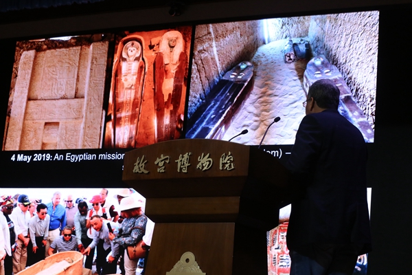Hany al-Tayep, supervisor of the scientific office of Egypt's Ministry of Antiquities, introduces recent archaeological discoveries in Egypt at the recent forum in Beijing.[Photo by Jiang Dong/China Daily] |
