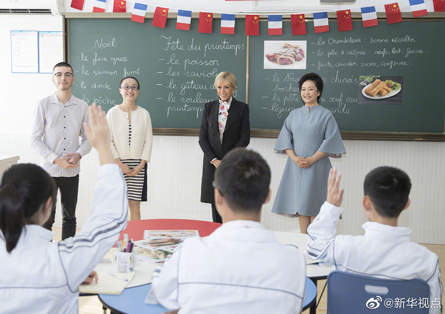 Peng Liyuan, wife of Chinese President Xi Jinping, visits a middle school in Shanghai together with Brigitte Macron, wife of French President Emmanuel Macron on Nov 5, 2019. [Photo/Xinhua]