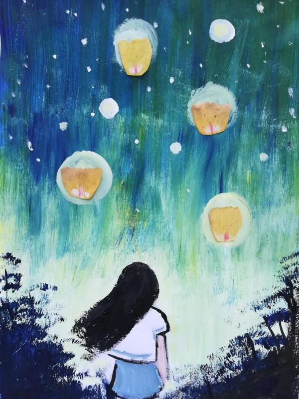 A girl watches sky lanterns. [Photo provided to Xinhua]