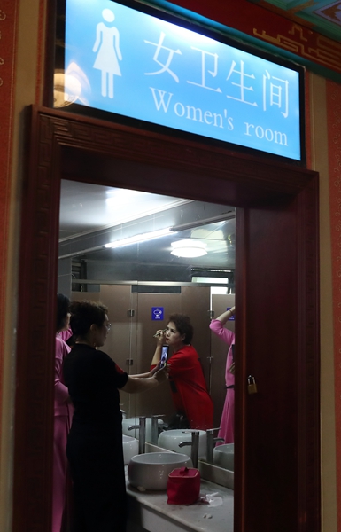 These elderly models usually have no dressing room and can only do makeup in the bathroom.[Photo by Wang Jing/China Daily]