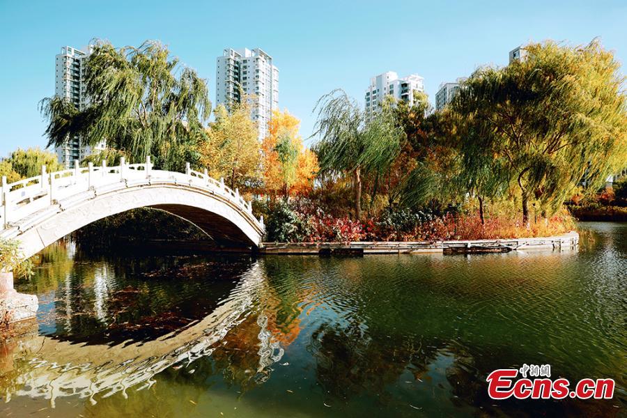 A beautiful view of Lixiang Lake, surrounded by trees with golden leaves, in Korla city, Northwest China's Xinjiang Uygur autonomous region, as temperatures continue to drop. The lake is a popular spot among local residents. [Photo/China News Service]