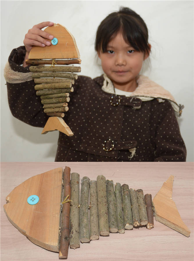Combo photo shows third grader Peng Yiran displaying a "fish" made by herself with branches (top) and her works of "fish" (bottom) at Xuqiao Primary School in Xuxing village of Tianxin district in Changsha, Central China's Hunan province, Nov 20, 2019. [Photo/Xinhua]