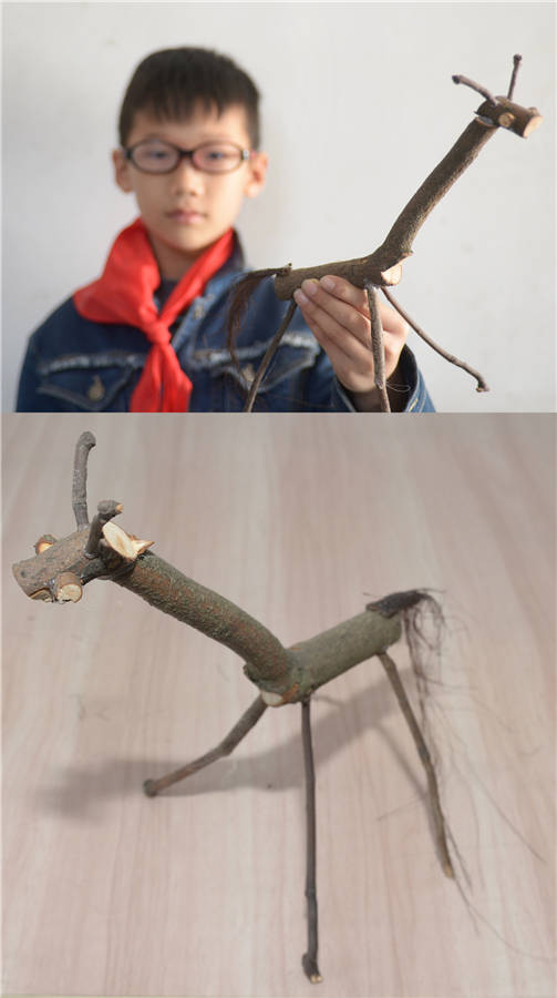Combo photo shows fourth grader Li Bohan displaying a "giraffe" made by himself with branches (top) and his works of "giraffe" (bottom) at Xuqiao Primary School in Xuxing village of Tianxin district in Changsha, Central China's Hunan province, Nov 20, 2019. [Photo/Xinhua]