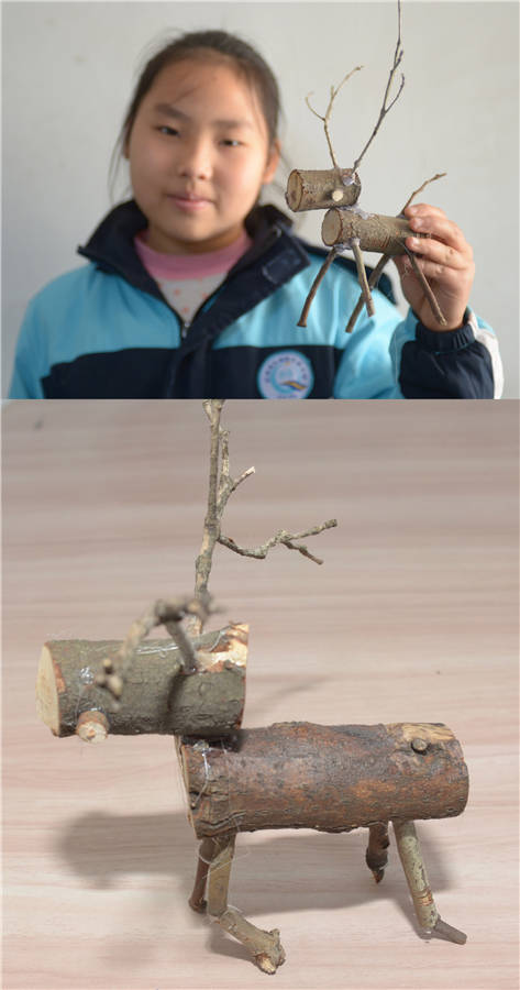 Combo photo shows fourth grader Tan Shiyu displaying an "elk" made by herself with branches (top) and her works of "elk" (bottom) at Xuqiao Primary School in Xuxing village of Tianxin district in Changsha, Central China's Hunan province, Nov 20, 2019. [Photo/Xinhua]