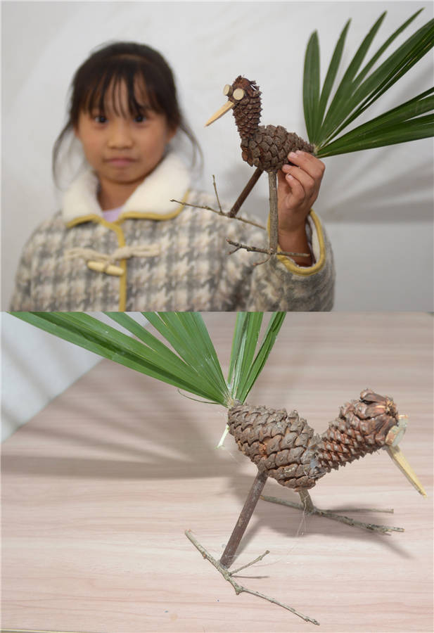 Combo photo shows third grader Tang Luoxun displaying a "peacock" made by herself with pine cones, branches and leaves (top) and her works of "peacock" (bottom) at Xuqiao Primary School in Xuxing village of Tianxin district in Changsha, Central China's Hunan province, Nov 20, 2019. [Photo/Xinhua]