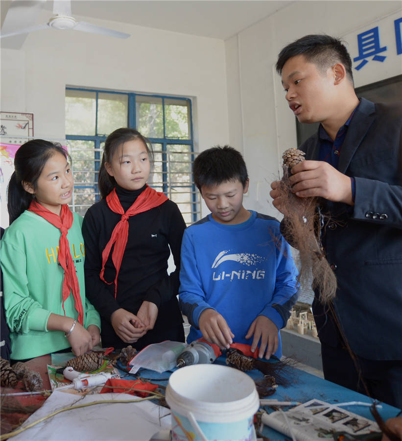 Art teacher Zhang Kun teaches students the making skills of handicrafts during an art lesson at Xuqiao Primary School in Xuxing village of Tianxin district in Changsha, Central China's Hunan province, Nov 19, 2019. [Photo/Xinhua]