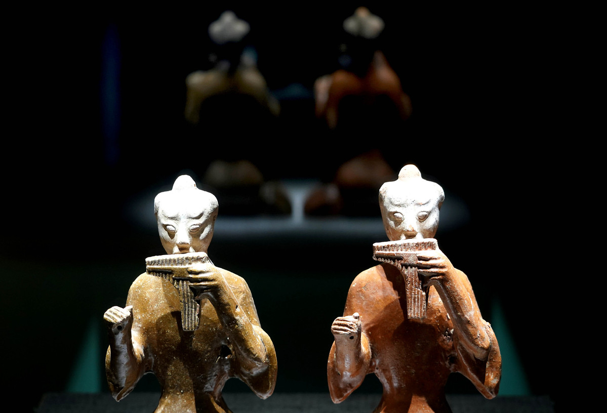 A pair of music-playing figurines are on display during an exhibition on music and dancing along the ancient Silk Road in Zhengzhou, Central China's Henan province, on Nov 19, 2019. More than 280 artifacts dating back to ancient China's Han, Tang, Song and Yuan dynasties are on display during the exhibition.[Photo/Xinhua]