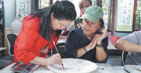 Chinese artist Kuku Chai Bu-kuk demonstrates porcelain painting skills to Filipino artist Rico Lascano in Liling, Hunan province, on Oct 21. [PHOTO BY MIRIAM ZHANG/CHINA DAILY] |