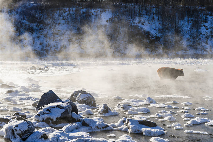 A cattle is seen in an unfrozen section of the Halha River in the city of Arxan of Hinggan League, North China's Inner Mongolia autonomous region, Nov 20, 2019. [Photo/Xinhua]
