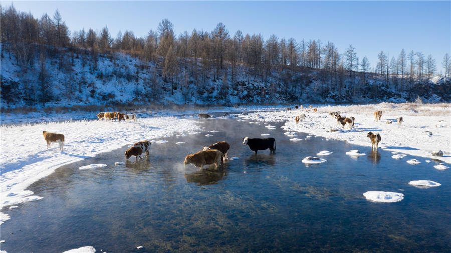 A herd of cattle drink water in an unfrozen section of the Halha River in the city of Arxan of Hinggan League, North China's Inner Mongolia autonomous region, Nov 20, 2019. [Photo/Xinhua]