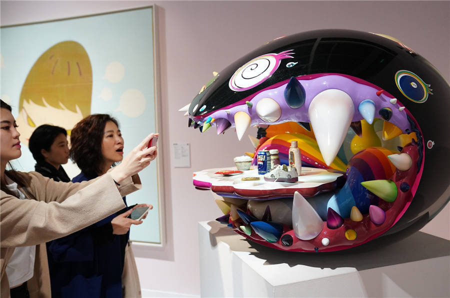 Visitors watch an artwork for auction during a media preview of the Christie's Hong Kong autumn auction 2019 in Hong Kong, South China, Nov 21, 2019. This year's Christie's autumn auction will be held from Nov 22 to 27. [Photo/Xinhua]