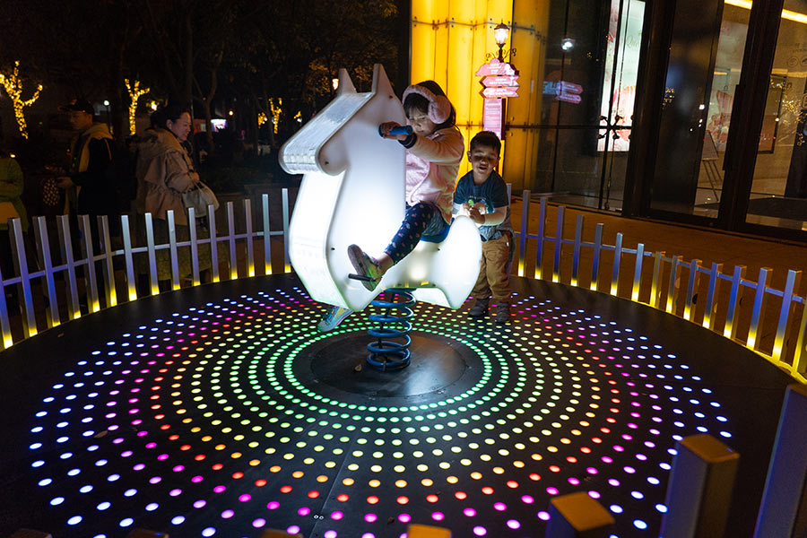With her brother dancing behind, a girl from Mexico sits on Never Ends, an installation created by Italian artists Luigi Console and Valentina Novembre featuring lights that twinkle and glow as the rider swings. [Photo by Gao Erqiang/chinadaily.com.cn]
