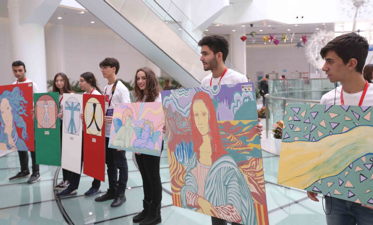 Senior high school students from Italy showcase artworks as a part of the 13th Sino–Italian Exchange Event in Beijing on Nov 25, 2019. [Photo by Zou Hong/ chinadaily.com.cn]