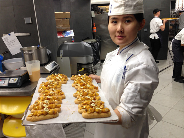 Dai Yuan during an internship at L'Eclair de Genie, one of the most popular puff pastry shops in France, after she graduated from Le Cordon Bleu in Reims, France. [Photo provided to China Daily] |