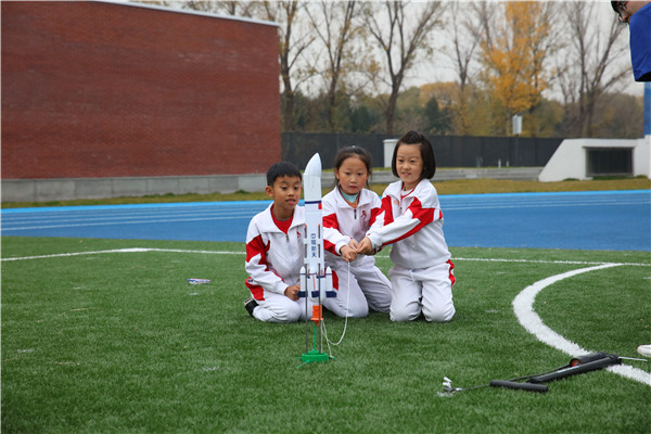 Students in Beijing hold simulated rocket launch experiments at the school's sports ground after the project launch event. [Photo provided to China Daily] |