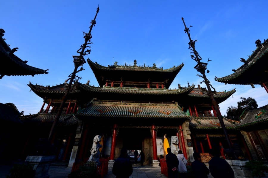 Photo taken on Nov 25, 2019 shows a building of the Shan-Shaan Guildhall architectural complex in Shedian town of Sheqi county, Central China's Henan province. The Shan-Shaan Guildhall was co-built by merchants from Shanxi and Shaanxi provinces who then lived in Sheqi county in the Qing Dynasty (1644-1911) in Shedian, a famous commercial township during the ancient Ming and Qing dynasties.[Photo/Xinhua]