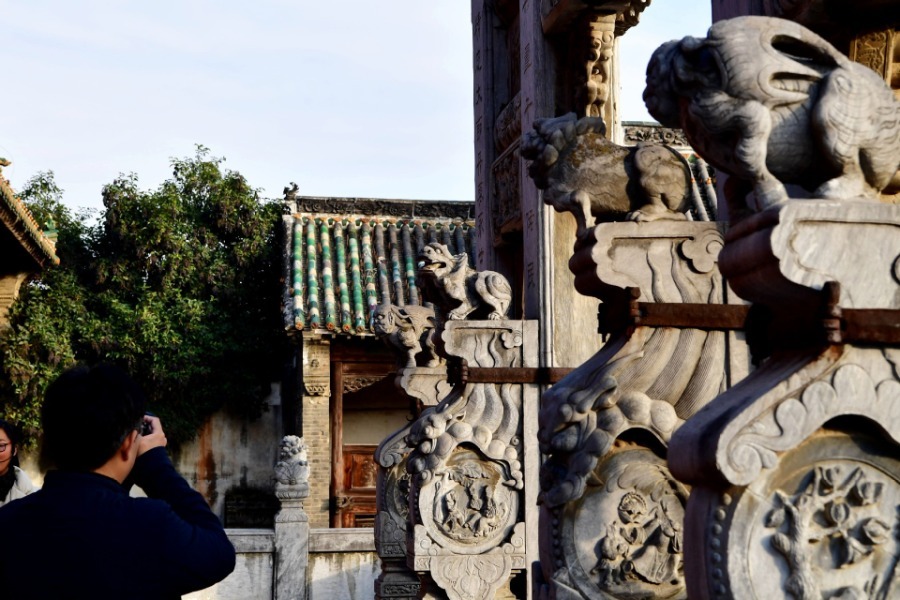 Photo taken on Nov 25, 2019 shows the stone statues of the Shan-Shaan Guildhall architectural complex in Shedian town of Sheqi county, Central China's Henan province. The Shan-Shaan Guildhall was co-built by merchants from Shanxi and Shaanxi provinces who then lived in Sheqi county in the Qing Dynasty (1644-1911) in Shedian, a famous commercial township during the ancient Ming and Qing dynasties.[Photo/Xinhua]