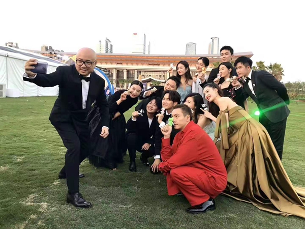 Filmmaker Xu Zheng (left) takes a photo with the crew of the film, Adoring, at the festival.[Photo provided to China Daily] |