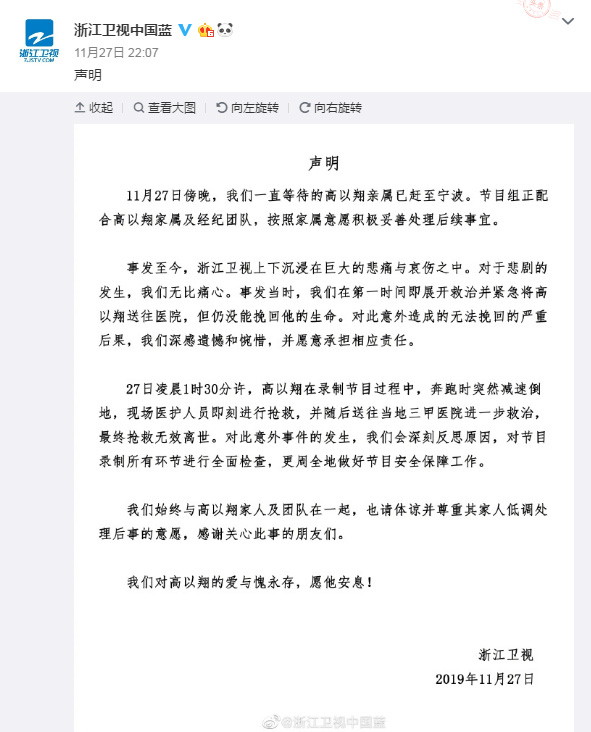 The statement restated that Gao received immediate first aid after he collapsed on the scene, and was rushed to the hospital as soon as possible. It also said that the network was "deeply regretful and sorry for this irreparable accident and the serious consequences it poses," and that the network was willing to bear the corresponding responsibilities.
