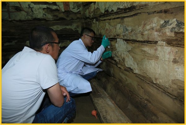 Archaeologists preserve murals in a newly excavated Tubo tomb in Ulan county, Qinghai province.[Photo provided to China Daily] |
