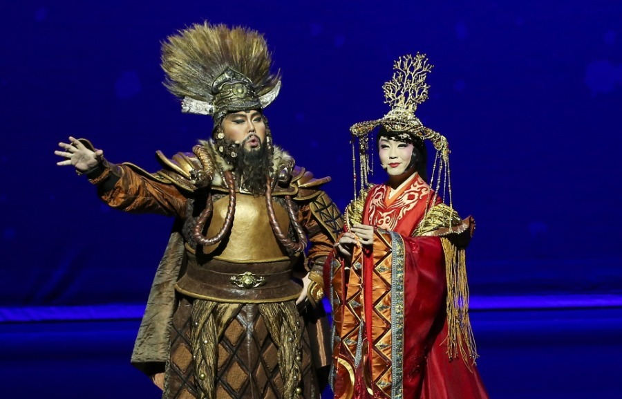 Artists perform during the Chinese musical "Lady Zhaojun" in San Diego, the United States, on Dec 1, 2019. "Lady Zhaojun", starring Chinese singer Li Yugang, presented its US premiere here Sunday night. A contemporary interpretation of the classic story of Wang Zhaojun, one of China's legendary ancient beauties, the production is a grand musical that incorporates the music and dance styles of Inner Mongolia and the Han Dynasty.[Photo/Xinhua]