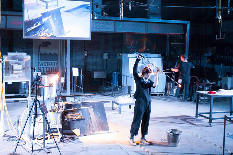 Artist Du Meng blows glass in her workshop. [Photo provided to China Daily] |