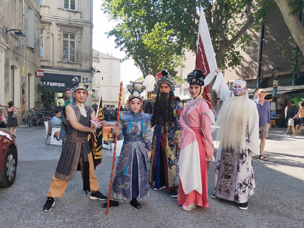 Kunqu Opera actors of A Commander's Introspectiontake photos on the street, while attending the Festival OFF d'Avignon.[Photo provided to China Daily] |
