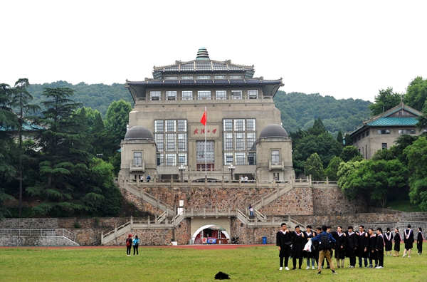 College graduates take photos in front of the landmark Main Administration Building of Wuhan University in the provincial capital of Central China's Hubei province.[Photo provided to China Daily] |